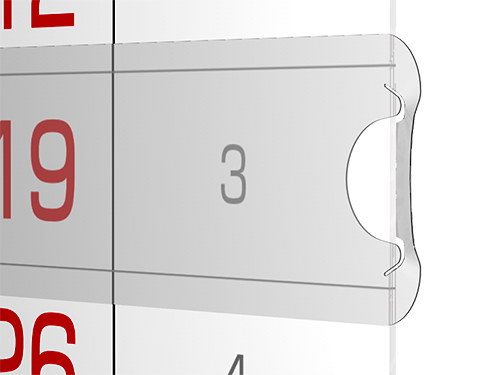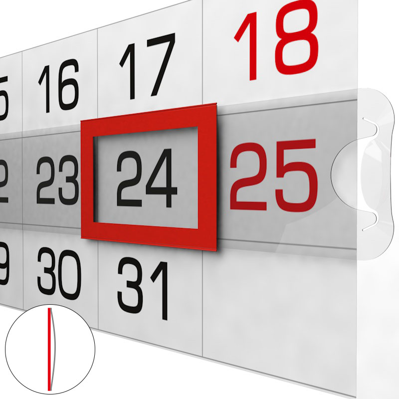 Лента – позволяет быстрое крепление на готовом календаре: Обычно цепляется боковыми вырубными элементами за края календарного блока (реже – за той же ширины подложку календаря). Материал – жесткий толстый прозрачный пластик. |